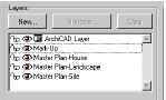 Модификация уровней: Откроем диалог Layers в меню Options. Кликнем на кнопке Select All а затем на кнопке Clear. Далее, выберем каждую комбинацию уровней по отдельности и и кликнем на кнопке Clear. И наконец, добавим три новых уровня с именами Master Plan-House, Master Plan-Landscape и Master Plan-Site. Кликнем на OK когда закончим.