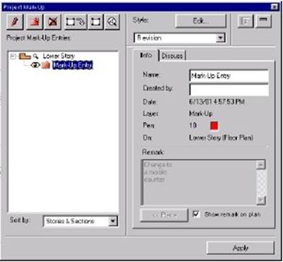 Редактирование метки: Если вы кликните на кнопке Extend/Compress в палитре Project Mark-Up. Окно Project Mark-Up Remark интегриовано в расширеную палитру, где так же доступно несколько дополнительных полей.