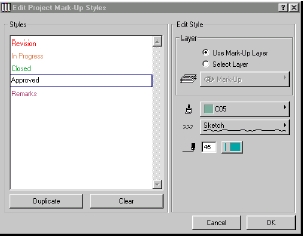 Создание стиля метки: вы можете определить и привязать стиль к метке, выбрав его из списка стилей. Изменить назначеный стиль можно и позже. Вы можете редактировать стили, присоединенные к метке, так чтобы различные метки выглядели поразному, изменяя тип линий, цвет, и так далее. Кликните на Edit в верхней правой части палитры Project Mark-Up. Отобразится диалоговое окно Edit Mark-Up Styles.