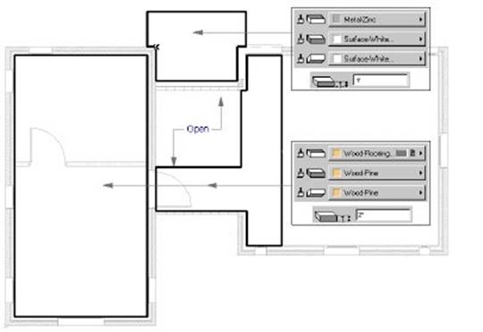 Инструмент создания стен (Stair Tool) Создание лестничных объектов Выбор типа перил Установка пролетов и ступенек Установка структуры лестницы Выбор перил Объект Перила Редактирование перил Размещение перил В данном разделе будем использовать чертеж, с которым мы работали в предыдущем разделе. 1. Создание лестницы на второй этаж: Перед добавлением лестницы мы должны добавить конструкционную плиту второго этажа. Редактирование параметров конструкционной панели: Перейдем к Верхнему этажу. Двойным кликом активизируем инструмент плит (Slab Tool) и установим параметры плиты как показано ниже. Прежде всего установим аттрибуты поэтажного плана и сечения и затем аттрибуты модели: Толщина плиты: 1'-0'' и Масштаб Плиты: 0'-0'' для проекта 0: 9'
