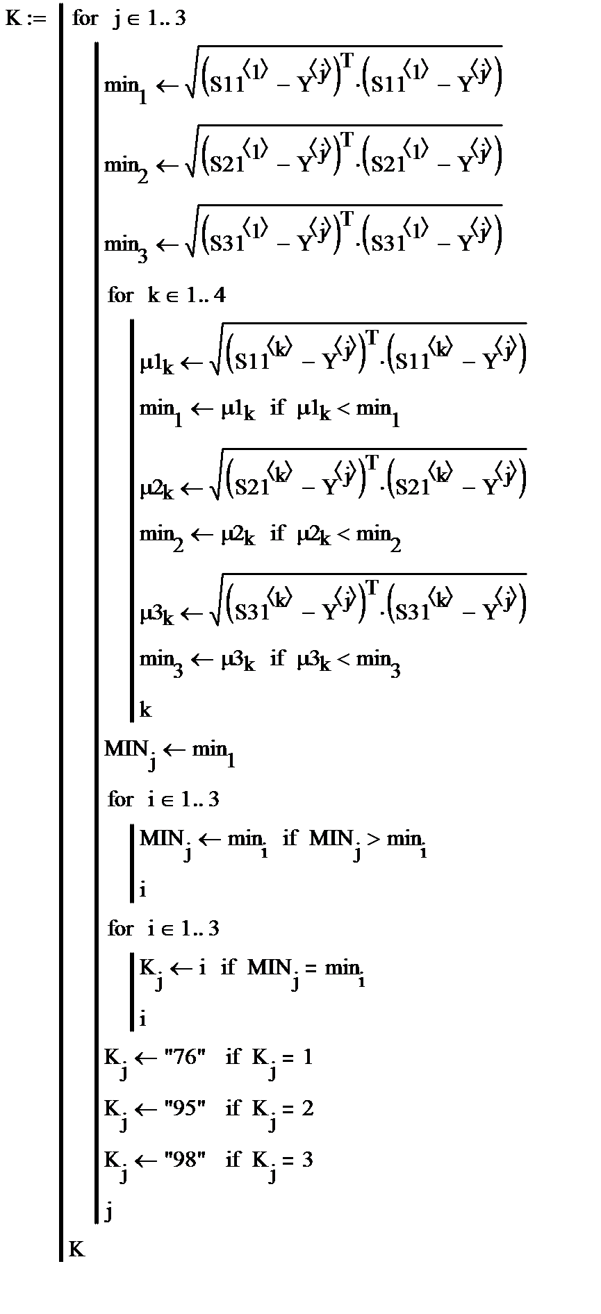 6. Составим программу поиска минимального расстояния между каждым из «неизвестных» и всеми известными спектрами (см рис.5). 7.Так как у нас три «неизвестных» спектра, то мы организуем цикл по j от 1 до 3. 8. Переменными min1,min2,min3 мы обозначим минимальные расстояния до спектров бензинов А-76, АИ-95 и АИ-98, соответственно. В начале мы присвоим им значения расстояний от «неизвестных» спектров до первого из спектров каждой группы. 9. В каждой марке бензинов мы имеем четыре известных спектра. Поэтому организуем цикл по «к» от 1 до 4-х. В этом цикле мы ищем минимальные расстояния от каждого из «неизвестных» спектров до спектров каждой марки. 10. Эти вычисленные минимальные расстояния циклом по «i» мы помещаем в вектор MIN. 11.Следующим циклом по «i» мы помещаем в вектор «К» условный номер марки бензина. Группа 1 – бензин А-76, группа 2 – бензин АИ-95, группа 3 – бензин АИ-98. 12.Наконец, для большей наглядности присваиваем группе 1 имя «76», а остальным, соответственно, имена «95», «98».