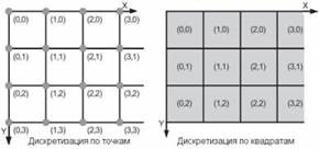 При дискретизации непрерывных изображений значения Aij могут определяться двояко, либо как значения точек Aij = (i, j), для которых определены атрибуты Cij, либо как значения квадратов Aij = (i, i+1) × (j, j+1) или любой другой формы, с определением Cij по средним значениям в пределах этой формы (рис. 17.1.1). На практике, как правило, X и Y - ограниченные наборы неотрицательных целых чисел квадратного или прямоугольного растра с аспектовым отношением (aspect ratio) ширины к высоте растра, которое записывается в виде, например "4:3". Представление цвета в машинной графике. Понятие цвета базируется на восприятии глазами человека электромагнитных волн в определенном диапазоне частот. Воспринимаемый нами дневной свет имеет длины волн λ от 400 нм (фиолетовый) до 700 нм (красный). Описанием светового потока может служить его спектральная функция I(λ). Свет называется монохроматическим, если его спектр имеет только одну определенную длину волны.