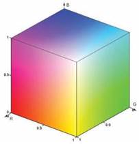 На сетчатке глаза находятся два типа рецепторов: палочки и колбочки. Спектральная чувствительность палочек (рис. 17.1.2) прямо пропорциональна яркости падающего света. Колбочки разделяются на три вида, каждый из которых имеет определенную чувствительность в ограниченных диапазонах с максимумами к красному, зеленому и синему цветам, и резко теряют свою чувствительность в темноте. Восприимчивость глаза к синему цвету значительно ниже, чем к двум другим. Важным свойством восприятия света человеком является линейность при сложении цветов с разными длинами волн. Цветовая модель RGB (Red, Green, Blue - красный, зеленый, голубой) в машинной графике в настоящее время является самой распространенной. В этой модели спектральная функция представляется как сумма кривых чувствительности для каждого типа колбочек с неотрицательными весовыми коэффициентами (с нормировкой от 0 до 1), которые так и обозначаются - R, G и B. Модель характеризуется свойством аддитивности для получения новых цветов. К примеру, кодировка спектральных функций: - черного цвета: fblack = 0, (R,G,B) = (0,0,0); - фиолетового цвета fviolet = fred + fblue, (R,G,B) = (1,0,1); - белого цвета fwhite = fred + fgreen + fblue, (R,G,B) = (1,1,1).