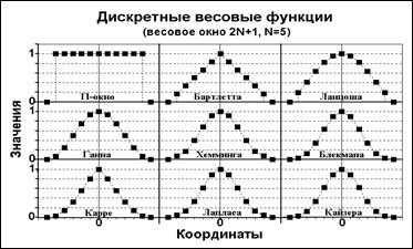 На рис. 17.2.3 и ниже, в таблице 17.2.1 приведены примеры наиболее распространенных одномерных фильтров для антиалисинга. Они могут выполняться и в виде аналоговых фильтров, и применяться, например, при передаче телевизионных строк изображений в аналоговой форме по радиоканалам (антиалиасинг по горизонтали). В принципе, подобная же операция может выполняться и по столбцам (дубль- изображение), и после суммирования изображения будет выполнена полная операция антиалисинга, но такой метод относится больше к области специальных научных исследований. Таблица 17.2.1. Основные весовые функции