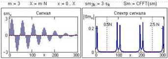 Первый шаг – интерполяция нулями, увеличивающая длину сигнала в m раз. (рис. 17.2.5). Нужно умножить все отсчеты исходного сигнала на m, а потом после каждого отсчета сигнала вставить m-1 нулевое значение. На интервале 0-Т, значение которого остается без изменения, теперь располагается в m-раз больше интервалов дискретизации (mN), и новый шаг дискретизации будет равен Dx=Dt/m. Соответственно, новая частота Найквиста для этого сигнала равна mp/Dt = mp. Но физическая величина шага по спектру в единицах частоты обратна физической величине интервала задания сигнала (Df=1/T), и, следовательно, БПФ по mN точкам сигнала вычислит mN точек спектра в главном диапазоне БПФ 0-2pm с шагом спектра исходного сигнала, в котором будут присутствовать m-периодов спектра исходного сигнала (один главный и m-1 боковых).