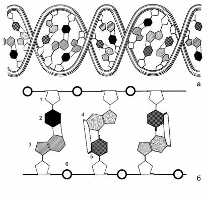 Рис. 2.2. Схема строения молекулы ДНК в виде двойной спирали (а) и прямой лесенки (б) (по В. Олфри и А. Мирскому). 1 – остаток 2-дезокси-β-D-рибозы, 2, 3, 4, 5 – азотистые основания (тимин, аденин, гуанин, цитозин, соответственно), 6 – остатки фосфорной кислоты.