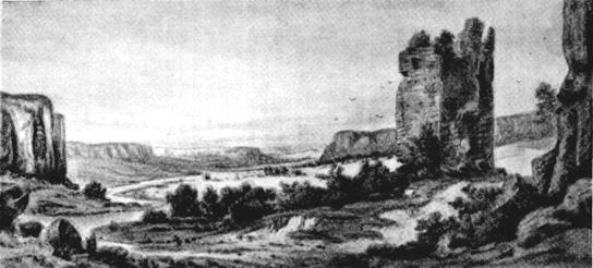 Рис. 43. Остатки византийских укреплений в долине р. Вит. Рисунок художника Ф. Каница (конец XIX в.). {189} Отношения славянских племен, особенно антов и аварского каганата, в течение всего времени существования последнего продолжали оставаться, по-видимому, крайне напряженными. Трудно сказать, насколько далеко на север и северо-восток простирались аварские владения, но несомненно, что некоторые склавинские и антские племена, покоренные аварами, входили в состав их разноплеменного государства. Современники неоднократно отмечали, что в войсках Баяна основную массу составляли не авары, а болгары и славяне. О подчинении в начале VII в. аварскому каганату восточнославянского племени дулебов рассказывает Начальная летопись: «В си же времяна быша и обри, иже ходиша на Ираклия царя и мало его не яша. Си же обри воеваху на словенех, и примучиша дулебы, сущая словены, и насилье творяху женам дулебьским: аще поехати будяше обърину, не дадяше въпрячи коня ни вола, но веляше въпрячи 3 ли, 4 ли, 5 ли жен в телегу и повести обърена, и тако мучаху дулебы» 1. Таким образом, подчинение отдельных славянских племен аварскому каганату не может подлежать сомнению. Однако совершенно несправедливы встречающиеся в историографии {190} утверждения, что с появлением аваров на Дунае они превратились как будто бы в основную военную и политическую силу, ведущую борьбу с империей, а склавины и анты отныне действовали якобы лишь как сателлиты каганата. Современники свидетельствуют, что в аварское время склавины и анты сохраняли свою самостоятельность, выступая в Балканских войнах, как военно-политическая сила, совершенно независимая от аваров. И, вероятно, прав был А. Л. Погодин, когда утверждал, что «власть авар простиралась лишь на тех славян, которые занимали Паннонию, но славяне не теряли при этом своей национальной самобытности. Тот факт, что при совместных вторжениях авар и славян источники постоянно упоминают и о славянах, указывает, по моему мнению, достаточно ясно на роль славян в таких набегах» 2. К этому необходимо еще добавить, что масштабы славянских вторжений на Балканы во второй половине VI в. значительно возросли как за счет увеличения собственных сил славян, так и за счет того, что аварский каганат, если оценивать его с точки зрения широкой исторической перспективы, являлся объективно союзником славян, сковывающим значительную часть вооруженных сил империи на Балканах. Именно в это время славянские вторжения на Балканы вступили в свою новую фазу. Славяне отныне появляются на полуострове не только как воины, но и как поселенцы, навсегда оседающие на завоеванных землях. В «Истории» Менандра рассказывается о том, как в 70-х годах VI в. авары потребовали уплаты дани у славян, живших на левом берегу Дуная, в пределах древней Дакии. Славянский вождь Добрит (Ловрита), по словам Менандра, ответил на это требование следующей речью: «Родился ли на свете и согревается ли лучами солнца тот человек, который бы подчинил себе силу нашу. Не другие нашею землею, а мы чужою привыкли обладать. И в этом мы уверены, пока будут на свете война и мечи» 3. Последующий за этим спор с аварскими послами кончился якобы вооруженной схваткой, во время которой авары были перебиты. Вскоре последовало грандиозное вторжение славян на полуостров, в котором, по словам Менандра, участвовало 100 тыс. 