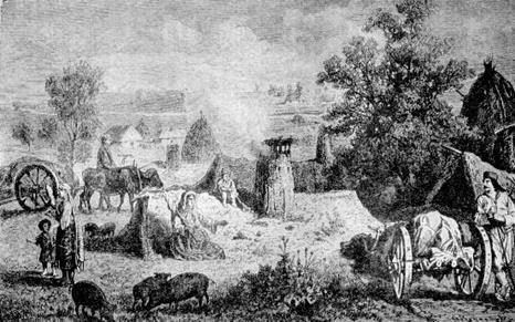 Рис. 45. Земляные жилища в Придунайской Болгарии по рисунку Ф. Каница (конец XIX в.). {199} встречалось, а лежащие здесь галичско-волынские земли Русью первоначально не назывались 1. Поэтому несомненный интерес представляет группа наименований, происходящих от наименования рос — русь и локализующихся в Северо-Восточной Болгарии и Южной Добрудже. Это — селение Рассава и город Русе на правом берегу Дуная и река Росица, приток Янтра, впадающего в Дунай несколько выше г. Русе. Наконец, интересно также отметить, что на территории Балканского полуострова, в его северо-восточной части, было найдено несколько бронзовых «пальчатых» фибул VI—VII вв., происходящих из области Среднего Поднепровья и являвшихся, по мнению Б. А. Рыбакова, одной из характерных форм антского убора. Немецкий археолог И. Вернер, изучавший эти фибулы, высказался за их восточнославянское происхождение 2. В ряду этих данных, говорящих о восточнославянском происхождении дунайцев, в особом свете представляют и походы Святослава, который называл дунайские земли «середой земли моей», и известное место из Воскресенской летописи, где города на Дунае именуются русскими городами. Останавливаясь на дунайцах — северянах и семи племенах дунайского Правобережья, мы отнюдь не хотим этим сказать, что только лишь они должны быть связаны с восточным славянством. Если придунайские области Балканского полуострова, как это можно предполагать на основании всего изложенного выше, были заняты более или менее целостной группой восточнославянских, антских племен, то отдельные их потоки несомненно проникли и в другие, более южные и западные части полуострова. Упомянутые Никитой Хониатом смоляне и драговиты, обитавшие в юго-восточной части полуострова около г. Солуни, а также драговиты фракийские могут быть сопоставлены с восточнославянскими племенами отнюдь не с меньшей долей вероятности, чем с полабскими племенами — драговичами и смолянами. Можно предполагать, что восточнославянское происхождение имели и многие другие племена балканских славян, в том числе и те, которые поселились далеко на западе. Об этом свидетельствует ряд поразительных совпадений, наблюдаемых в этнографических материалах, в частности в одежде населения некоторых местностей Югославии и восточных славян. Этот вопрос, однако, требует специального исследования. {200} Итак, представляется совершенно бесспорным, что славянские племена, в частности славяне восточные, явились одним из решающих факторов крупнейших исторических преобразований, пережитых Восточной Европой в VI—VII вв. Участие славян в этих преобразованиях заключалось не только в том, что их длительная борьба на Балканах намного ускорила процесс социально-экономического переустройства империи — последнего оплота рабовладельческого мира в Европе, но также и в том, что, заселив Балканский полуостров и некоторые прибрежные области Малой Азии, славяне принесли в империю много нового и прежде всего — свое общинное устройство, точно так же, как древние германские племена в V в. принесли в Италию «осколок настоящего родового строя в форме марковых общин» 3. Территориальная или сельская община, «омолодившая» империю, и примитивная форма эксплуатации путем взимания дани послужили одним из краеугольных камней складывающихся в Византии феодальных отношений. 