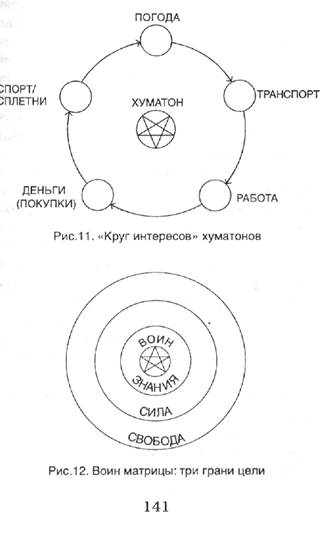 Хуматоны, совершенно утратившие связь с органической матрицей природы и инстинктами, создали суррогаты, чтобы восполнить свою жизнь на анималистическом уровне. Дикие животные сосредоточены на пище, укрытии, спаривании, потенциальных хищниках и т. п., потому что не могут пренебречь инстинктами и подвергнуть свою жизнь опасности. В этом смысле у них нет выбора, и к тому же их сосредоточенность, или «беспокойство», постоянно поддерживается внутренними и внешними факторами (голодом, погодными условиями, опасностью со стороны хищников и т. д.). Их беспокойство — естественная реакция на окружающую среду. Хуматонам, у которых нет ни внешних, ни внутренних естественных стимулов, и стимулы, и соответствующие реакции поставляет матрица. На самом деле хуматонов беспокоит пустота и бесплодие их жизни, зияющая в них бездна, полное отсутствие индивидуальности. Поэтому они с благодарностью принимают те внешние проблемы и внутреннее волнение, которые обеспечивает им матрица, чтобы заглушить зарождающиеся страх и отчаяние. Когда хуматоны собираются вместе, они концентрируются на предметах и событиях, которые служат целям укрепления чувства безопасности и единства душ, а это именно те темы, которые характеризуют (и ограничивают) их как хуматонов. На самом деле, в отличие от животных, большинству хуматонов нет нужды беспокоиться о пище, погоде, работе и транспорте, потому что все это обеспечивает матрица, чтобы удерживать их в постоянной зависимости (а также чтобы они жили достаточно комфортно и не слишком задавались вопросами о смысле жизни). С другой стороны, и это общее правило, все блага матрицы условны, и она постоянно поддерживает в хуматонах это чувство, зарождая тем самым в них сомнение: долго ли все это будет продолжаться? Дом заложен, работа непостоянная, затраты на транспорт постоянно растут, и так далее и тому подобное. Хуматоны не могут позволить себе расслабиться и хоть к чему-нибудь отнестись как к само собой разумеющемуся, а значит, не могут сосредоточиться на других вещах, например на творческой активности. Кроме того, используя средства массовой информации, матрица показывает голодающие народы, взорванные школы и церкви, больных детей, страдающие меньшинства, давая тем самым понять, в каком привилегированном положении находятся хуматоны. Более того, матрице необходимо, чтобы все единицы были не просто подключены и находились в пределах досягаемости, но и чтобы они действительно испытывали чувство благодарности за все те удобства и поддержку (и ценности!), которыми она их обеспечивает. В таких условиях любые сомнения в матрице, а тем более мятеж против нее сводятся к минимуму. Поэтому воины матрицы — те, кто начал мятеж и отключение, — чрезвычайно редкое явление, для других хуматонов они — в лучшем случае — сбившиеся с пути, в худшем — больные. Эти единицы взбунтовались против коллективной экономики, и их нужно удалить. Самую большую подозрительность и негодование у среднего хуматона вызывает то, что воины матрицы совершенно безразличны к тем вещам, которые хуматоны воспринимают как важнейшие. Воины должны соблюдать осторожность и не выдать свое вопиющее неуважение к программе, так как хуматоны воспринимают это как неуважение к общечеловеческим ценностям и видят в воинах психопатов. Воины матрицы плывут против течени