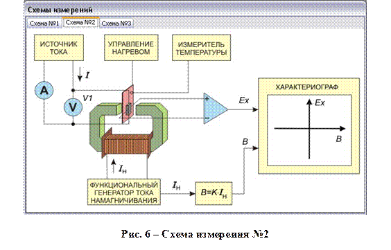 На каждой схеме присутствует свой набор управляющих и регистрирующих инструментов. Схема измерений № 1. Эта схема предназначена для проведения однократных измерений с последующим изменением установок источников воздействия или однократных измерений при изменении температуры в результате нагрева или охлаждения. То есть, схема реализует измерение характеристик «по точкам», например, зависимость э.д.с. Холла от индукции магнитного поля, рисунок 5.