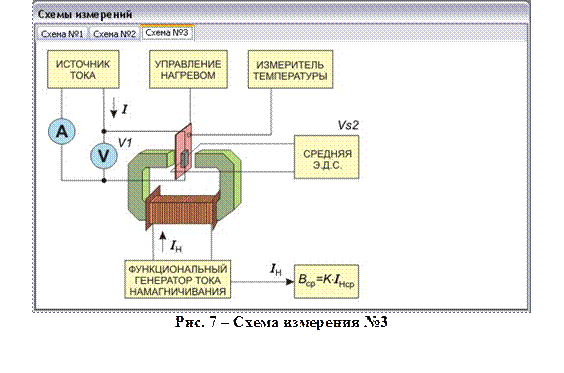 То есть, схема реализует измерение характеристик «целиком» (например, зависимость э.д.с. Холла от индукции магнитного поля). Следует отметить, что измерение полностью характеристики с большим количеством точек – достаточно длительный процесс, за время которого температура может сильно измениться. Поэтому не рекомендуется проводить температурные измерения, используя эту схему. На схеме присутствуют следующие элементы: Измеритель температуры. Управление нагревом. Предназначено для включения (выключения) нагрева. Образец. Можно просмотреть данные об образце. Вольтметр V1. Предназначен для измерения напряжения вдоль линии тока. Источник тока. Предназначен для изменения тока через образец. Амперметр (А). Предназначен для измерения силы тока. Характериограф. Предназначен для измерения зависимости э.д.с. Холла от индукции магнитного поля. Функциональный генератор тока намагничивания. Предназначен для пилообразного изменения тока через катушку, создающую магнитное поле в образце. Схема измерений № 3 (рисунок 7).Эта схема предназначена для проведения однократных измерений с последующим изменением установок источников воздействия или однократных измерений при изменении температуры в результате нагрева или охлаждения, то есть, схема реализует измерение характеристик «по точкам» (например, зависимость э.д.с. Холла от индукции магнитного поля). Эта схема аналогична схеме №1. Отличие состоит в том, что специальный вольтметр Vs2 и измеритель индукции B, измеряют положительные и отрицательные значения и определяют среднее. Такая возможность позволяет исключить из результатов измерений остаточную э.д.с. Холла, которая присутствует при нулевой индукции магнитного поля. На схеме присутствуют следующие элементы: Измеритель температуры. Управление нагревом. Предназначено для включения (выключения) нагрева. Образец. Можно просмотреть данные об образце. Вольтметр V1. Предназначен для измерения напряжения вдоль линии тока. Источник тока. Предназначен для изменения тока через образец. Амперметр (А). Предназначен для измерения силы тока. Вольтметр специальный Vs2. Предназначен для измерения средней э.д.с. Холла. Измеритель средней индукции (B ср ). Предназначен для измерения средней величины индукции магнитного поля.