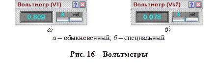 Вольтметр. Измеряет напряжение. На схеме имеются два вольтметра: V1 и V2. Первый из них предназначен для измерения падения напряжения на образце, второй – для измерения э.д.с. Холла. Оба прибора совершенно одинаковы, рисунок 16, а. Вольтметр специальный Vs2. Предназначен для измерения средней э.д.с. Холла. Как и у простых вольтметров, имеется возможность изменять размерность. Измеряет амплитудные значения положительного и отрицательного импульсов, а затем рассчитывает среднее значение, рисунок 16, б.