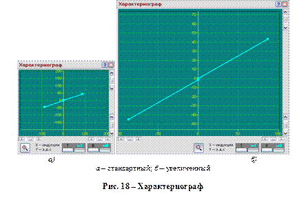 Необходимость в таком приборе связана с тем, что в реальных датчиках Холла существует начальная э.д.с. Холла, т.е. э.д.с. при нулевом значении магнитной индукции (но не нулевом значении тока через образец). Если измерить э.д.с., соответствующее положительному и отрицательному значению, а затем найти среднее значение, то начальная э.д.с. Холла при такой операции вычитается. Поскольку индукция магнитного поля меняет при этом знак, то требуется также измерять среднее значение. Такой прибор используется в схеме измерений, в которой ток через катушку задается функциональным генератором, формирующим импульсы одинаковой амплитуды и чередующейся полярности. Характериограф. Предназначен для измерения зависимости э.д.с. Холла от индукции магнитного роля, рисунок 18. Как и у всех регистрирующих приборов, на окне имеется возможность выбора размерности (по обеим осям). В углах области визуального представления измеренного сигнала расположены элементы управления масштабом вывода на экран