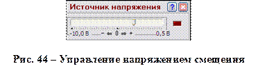 Управляющие и регистрирующие инструментыНа каждой измерительной схеме присутствует свой набор инструментов. Их можно разделить на управляющие и регистрирующие. Управляющиеинструменты – это инструменты, связанные с источниками воздействия. Управляемый источник напряжения. Предназначен для изменения напряжения смещения (напряжения в рабочей точке) на образце (рисунок 44).