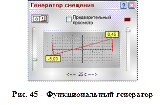Позволяет при помощи ползунка изменять значение постоянного напряжения на образце. Напряжение может изменяться как в отрицательную (обратное напряжение), так и в положительную (прямое напряжение) сторону. Максимальные значения напряжений определяются образцом, подключенным в данный момент. Конкретное значение можно узнать, щелкнув на схеме измерений «Образец». Передвигать ползунок можно либо с помощью «мыши» (нажав на левую кнопку и, не отпуская кнопку, перемещая «мышь»), либо с помощью стрелок на клавиатуре. В правой части прибора расположен индикатор перегрузки преобразователя ток-напряжение по постоянному току. При наличии перегрузки передвижение ползунка в сторону увеличения напряжения не имеет эффекта, т.е. прибор начинает работать в режиме стабилизации тока. Функциональный генератор. Предназначен для пилообразного изменения напряжения смещения на образце (рисунок 45).