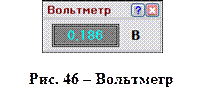 Генератор работает в измерительных схемах, в которых в качестве регистрирующего прибора применяется характериограф или осциллограф. Поэтому появляется необходимость в периодическом линейном (пилообразном) изменении напряжения. График одного периода работы генератора изображается на диаграмме рабочего окна. С помощью ползунков можно изменять амплитудное значение напряжения от максимального прямого до максимального обратного значения. Максимальные значения определяются образцом, подключенным в данный момент. Конкретное значение можно узнать, щелкнув на схеме измерений «Образец». Передвигать ползунок можно либо с помощью «мыши» (нажав на левую кнопку и, не отпуская кнопку, перемещая «мышь»), либо с помощью стрелок на клавиатуре. Цифры на диаграмме рабочего окна отображают значения максимального и минимального значений напряжения смещения при работе генератора. Генератор имеет кнопку Предварительный просмотр. Этот режим позволяет снимать характеристику достаточно быстро, но с большой погрешностью измерений и малым количеством точек. Он предназначен для оценочного наблюдения характеристики, чтобы можно было определить нужный предел измерений, выбрать необходимые границы изменения напряжения смещения. Для начала работы функционального генератора следует нажать тумблер, расположенный в его левом верхнем углу. При любом изменении параметров генератора, он автоматически выключается. В правой верхней части прибора расположен индикатор перегрузки преобразователя ток-напряжение по постоянному току. При наличии перегрузки передвижение ползунка в сторону увеличения напряжения не имеет эффекта, т.е. прибор начинает работать в режиме стабилизации тока. Регистрирующие инструменты – это измерительные приборы, которые представляют измеренные данные. Вольтметр. Предназначен для измерения постоянного напряжения (напряжения смещения на образце), представлен на рисунке 46.