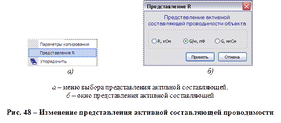 При измерении активная и реактивная составляющие проводимости представляются соединенными параллельно. Для реализации таких измерений прибор имеет генератор синусоидального сигнала, амплитуду которого можно выбирать из двух значений – 250 или 25 мВ. Также есть переключатель пределов измерений. Он общий на обе составляющих проводимости и проградуирован в пФ. Чем меньше значение предела, тем точнее измеренное значение. В случае перегрузки прибора, показания выводятся красным цветом. Реактивная составляющая проводимости всегда представлена в виде емкости и измеряется в пФ. Программное обеспечение допускает различное представление активной составляющей. Изменить его можно из меню (рисунок 48).