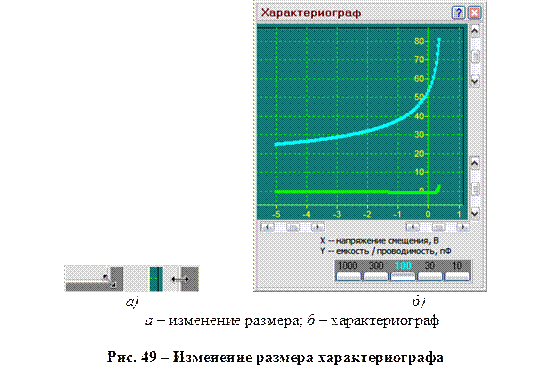 Возможный выбор состоит из трех значений: - сопротивление R, в килоомах; - G/w, в пФ (проводимость, деленная на круговую частоту, w = 2π·106); - проводимость G, в микросименсах. Выбор представления активной составляющей проводимости влияет на все окна, в которых появляется эта величина, кроме характериографа, в котором всегда в виде Gdw (G / w). Внимание: не изменяйте этот параметр в течение измерения. Характериограф. Предназначен для измерения зависимости активной и реактивной составляющих проводимости (ось Y) образца на фиксированной частоте 1 МГц от напряжения смещения (ось X). В углах области визуального представления измеренных данных расположены элементы управления масштабом вывода на экран Если размер экрана характериографа слишком мал, а требуется рассмотреть характеристику более внимательно, можно изменить размеры окна стандартным для Windows способом, т.е. подвести курсор «мыши» к любому краю окна и, когда он измениться на двухсторонние стрелки, изменить размеры, рисунок 49. Конечно, таких элементов управления нет на реальных осциллографах, но для данных конкретных измерений они более удобны. Остальные элементы управления аналогичны элементам Измерителя C G. Как реактивная, так и активная составляющие проводимости всегда представлены в виде емкости и измеряется в пФ. В отличие от Измерителя C G, изменить представление активной составляющей нельзя, поскольку ось Y здесь общая, но записываться результаты в рабочую тетрадь будут в том же представлении, как выбрано для измерителя.