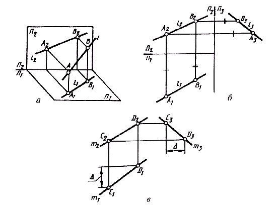 Учитывая то, что прямую линию в пространстве можно определить положением двух ее точек, для построения ее на чертеже достаточно выполнить комплексный чертеж этих двух точек, а затем соединить одноименные проекции точек прямыми линиями. При этом получаем соответственно горизонтальную и фронтальную проекции прямой. На рис. 69, а показаны прямая l и принадлежащие ей точки А и В. Для построения фронтальной проекции прямой l2 достаточно построить фронтальные проекции точек А2 и В2 и соединить их прямой. Аналогично строится горизонтальная проекция, проходящая через горизонтальные проекции точек А1 и В1. После совмещения плоскости П1 с плоскостью П2 получим двухпроекционный комплексный чертеж прямой l (рис. 69, б). Профильную проекцию прямой можно построить с помощью профильных проекций точек А и В. Кроме того, профильную проекцию прямой можно построить, используя разность расстояний двух ее точек до фронтальной плоскости проекций, т. е. разность глубин точек (рис. 69, в). В этом случае отпадает необходимость наносить оси проекций на чертеж. Этот способ, как более точный, и используется в практике выполнения технических чертежей.