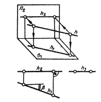 Относительно плоскостей проекций прямая может занимать различное положение. Прямую, не параллельную ни одной из основных плоскостей проекций (см. рис. 69), называют прямой общего положения. Прямую, параллельную или перпендикулярную одной из плоскостей проекций, называют прямой частного положения. Прямые, параллельные одной из плоскостей проекций, называют прямыми уровня. Название их зависит от того, какой плоскости они параллельны. Прямую, параллельную горизонтальной плоскости проекций, называют горизонталью и обозначают на чертежах h (рис. 70). Прямую, параллельную фронтальной плоскости проекций, называют фронталью и обозначают f (рис.71).
