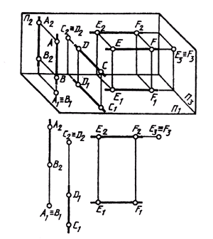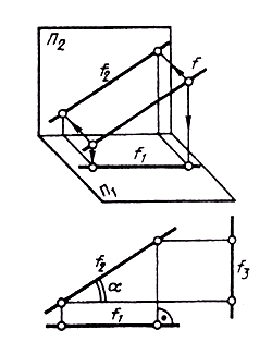 f3 _|_ П2/П3; p1 _|_ П2/П1; p2 _|_ П2/П1; Прямые h2 и f1 перпендикулярны вертикальным линиям связи; р1 и р2 располагаются на одной вертикальной линии связи и при двухпроекционном чертеже должны быть определены двумя точками прямой р. Прямые, перпендикулярные одной из плоскостей проекций, называются проецирующими. Эти прямые, будучи перпендикулярными одной плоскости проекций, оказываются параллельными двум другим плоскостям проекций. Поэтому у проецирующих прямых одна проекция превращается в точку, а две другие проекции параллельны самой