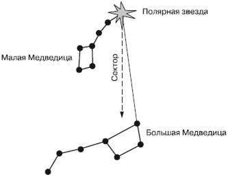 Рис. 6.22. Ориентирование по Полярной звезде Ориентирование по луне. Для приблизительного ориентирования полезно знать, что летом в первую четверть луна в 20 часов находится на юге, в 2 часа ночи – на западе, в последнюю четверть в 2 часа ночи – на востоке, в восемь утра – на юге. При полнолунии ночью стороны горизонта определяют так же, как по солнцу и часам, причем луна принимается за солнце.