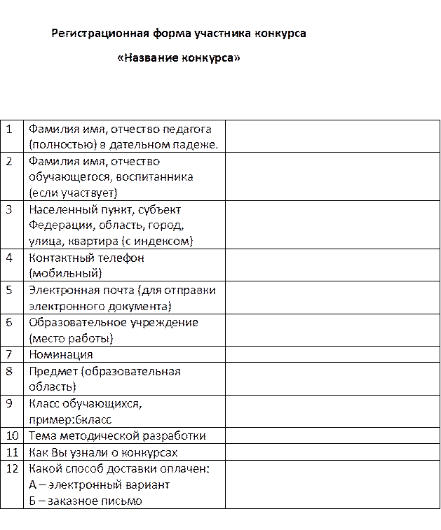 Условия участия в конкурсе: Участниками конкурса могут быть воспитатели детских садов, методисты, учителя школ, гимназий, лицеев, педагоги дополнительного образования, коррекционного образования, преподаватели НПО и СПО, учащиеся ОУ. Допускается участие работ, выполненных коллективом учителей. Если оплату производит каждый педагог, то все участники коллективной работы получают отдельный документ. Номинации для обучающихся: