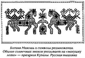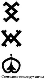 Как уже говорилось выше, тема единения и конфликта двух диаметрально противоположных сил — один их главных, если не главный закон в язычестве, закон существования мира. Это и дуальная пара Правь-Навь, это и день с ночью, это, наконец, мужчина и женщина. Правь — царство всепобеждающей правды, справедливости, царство светлых богов, в нем располагается прекрасный Ирийский сад с молодильными яблоками и молочной рекой, в нем живут волшебные птицы, туда попадают люди, жившие по Прави — справедливо, по совести (подобно саду Гесперид греческих мифов). Навь — темное царство хаоса и разрушения, в нем живут темные боги и люди, живущие по законам Кривды. Конфликт между ними понятен — Навь пытается уничтожить мир, Правь пытается его сохранить, блюдет в нем свой порядок; единение же их в том, что ни одна из этих сил не может ни победить, ни проиграть, без них мир немыслим, их существование — условие существования мира, их единение мы наблюдаем в мире Яви, мире людей; человек, между прочим, также является олицетворением единения этих двух сил (см. главу «Символика воды»). Вообще о Прави и Нави можно говорить бесконечно, так что отошлем интересующихся, например, к работам Б. А. Рыбакова, В. Иванова, Д. Гаврилова, А. Платова и др. Дуальная пара — мужчина и женщина — это также союз двух начал. Считается, что у мужчины преобладает разумное начало, у женщины — чувственное. Здесь можно проводить аналогию с Правью и Навью, однако это все же несколько иной конфликт: мы не можем говорить о том, что мужчина — олицетворение Прави, а женщина — Нави, однако им могут быть присущи особенности как Прави, так и Нави (все зависит от человека). Человек, склонный к Прави, если это мужчина, будет «мыслить по Прави», подобно светлым богам, если же это женщина, она будет «чувствовать по Прави», как это делают светлые богини — Лада, Леля, Жива и другие. Однако если человек склонен к Нави, он будет подобен Вию, Кощею, змею Юше или же Морене (если это женщина). Единение мужчины и женщины символизирует крест и ему подобные знаки. Еще одна дуальная пара — небо и земля. В традиционном представлении земля — мать, небо — отец. Небо оплодотворяет землю небесной водой, дождем, земля родит растения. Такой родительский аспект здесь основной, в отличие от пары мужчина — женщина, где он отходит на второй план. Что же касается символов подобных единений, то они представляют собой переплетенные прямые, в итоге срастающиеся в одну, перекрещивающиеся прямые, короче говоря, двучастные знаки, переходящие в одночастные. Это противопоставление часто выражается наличием в мифах двух одноименных персонажей: Див — Дива, Род — Рожаница. Конечно, мужской и женский род оказали влияние и на мифологические олицетворение предметов бесполых — земли, неба, воды, огня и т. д. Часто одно и то же понятие могло принимать форму и мужского, и женского рода. Это колебание заметно прежде всего в обращении к солнцу. Первоначально солнце считалось славянами женским началом, потому что обладало силой плодородия. Народная загадка про солнце «Красная девушка в окно глядит» подтверждает версию о том, что солнце — красная девица — было женского рода. В русском сказании, в котором солнце олицетворялось в женском образе, говорилось, что в декабре, «когда зима поворачивает на лето», Солнце, нарядившись в праздничный сарафан и кокошн