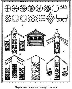 Комплексы знаков четко группируются по суточным позициям солнца— в одну группу входят комплексы, отвечающие восходящему и заходящему солнцу, а в другую — полдневные, изображающие солнце в зените. Утро и вечер. На нижних концах причелин, соответствующих в общей картине небесного хода солнца восходу и закату, почти всегда находятся рядом знаки солнца и знаки земли. Чаще всего солнце изображается ниже земли — оно ведь еще только должно взойти: иногда над землей помещают половину солнечного знака — солнце восходит. а) «Полотенца» утреннего, полуденного и вечернего комплексов с охранными знаками; б) Полуденный комплекс изображения всего суточного солнца (три дневных солнца и два ночных и белого света — в центре); в) Утренний охранный комплекс узоров: символ ночного солнца на «полотенце» и восходящего — на причелине; г) «Полотенце» с изображением белого света; д) «Полотенца» полуденного комплекса с двумя солнцами и крестом Иногда солнце показано уже взошедшим, находящимся над землей; в этих случаях земля показана не прямоугольником, а знаком плодородия — перекрещенным квадратом. В комплексе нижних концов причелин очень часто солнце изображается «бегущим», что вполне соответствует зрительному восприятию хода солнца — при восходе и закате особенно ощутимо движение светила, быстро поднимающегося или опускающегося по отношению к горизонту. Полдень. Полдневное солнце изображалось на фасаде избы, на самом верху, под главенствующей фигурой щипцового[3] коня, но, как уже говорилось, все же ниже «хлябей небесных», являвшихся верхним небом. Для того чтобы оставить солнце в надлежащем ему ярусе, старинные умельцы приделывали к щипцу короткую доску-«полотенце», свисавшую вертикально вниз по фасаду. Вот на нижнем конце этого «полотенца» и размещался полуденный комплекс солнечных знаков. Полуденный комплекс всегда был богаче утренне-вечерних. Чаще всего здесь изображались два солнца, подобно тому как на календаре месяц летнего солнцестояния (июнь) обозначался не одним крестом, как другие солнечные фазы, а двумя крестами. Два солнца, расположенные одно под другим, могли быть одинаковыми (обычно с шестью лучами), но одно из них могло быть дано в динамической форме бегущего колеса. В отдельных случаях (в христианские времена) над солнцами помещалось изображение православного креста, придававшее ясность семантике солнечных знаков, — они тоже были священны и обладали такой же силой, как и крест, которым отгоняли бесов. На некоторых «полотенцах» изображался весь суточный ход солнца: наверху три дневных позиции солнца (утро, полдень и вечер), внизу две позиции ночного подземного солнца, а в центре — огромный лучистый круг, символизирующий «белый свет», Вселенную, осиянную, по мнению русских людей XII–XIII вв., «неосязаемым и неисповедимым светом». Символы земли, как правило, отсутствуют в полуденной композиции, но иногда они все же изображаются. В этих случаях они обязательно сопряжены с солнцем: или солнце светит на подступающую к нему (сверху и снизу) землю, или же маленький символ земли помещают между двумя бегущими солнцами, и он оказывается как бы всесторонне освещенным. Свастика