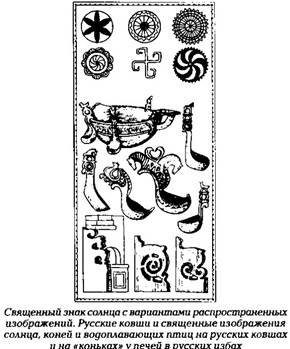 Солярная символика — символика солнечной стихии, солнца, солнечных светлых богов. Боги солнца в славянском язычестве — Даждъбог, Сварог, Хорс. Они — светлые, то есть представляющие силу Прави боги. Правь — верхний, небесный мир в славянской мифологии. Славяне представляли Правь как идеальный мир, где господствуют законы справедливости и чести. Об этом нам говорят многие русские слова: правильный (как в Прави), справный (с Правью), правило (по справедливости), правый (в обоих значениях). Солярная символика — одна из самых светлых в славянской традиции. Среди солярных знаков, пожалуй, нет ни одного, приносящего вред. Наоборот — все знаки связаны с приобретением как материальных, так и духовных благ, приумножением их. Солнце в язычестве также и всевидящее око, именно поэтому, если была нужда, совершали преступление ночью — авось боги Прави не заметят; поэтому же ночью активизируется нечисть и темные волшебники. В солнечное же время суток, наоборот, преобладают светлые силы, помогающие человеку и природе. Однако это — только одна сторона медали. Солнце Изображение небесных вод было лишь частью более общей картины мира, где небесно-водный ярус был только отдаленным фоном, а главным являлось солнце в своем размеренном пути по небосводу среднего неба. Чрезвычайно важно отметить, что во всем декоре русских изб XVIII–XIX вв., на всем обширном пространстве двенадцати северных губерний России солнечные знаки, изобилующие в этом декоре, никогда не помещались выше небесно-водной зоны, т. е. не нарушали древних славянских представлений о верхнем небе. Зоной движения солнца со времен энеолита было среднее небо, отделенное твердью от небесно-водной зоны верхнего неба. С удивительной строгостью соблюдалась эта древняя картина мира в системе архитектурного убранства: путь солнца по среднему небу подчеркнут тем, что для показа солнечных знаков применялись искусственные, не игравшие никакой конструктивной роли особые доски — «полотенца», спускавшиеся от причелин[2] вертикально вниз. Положения светила при восходе и закате обозначались помещением солнечных знаков у нижнего торца обеих причелин, и они оказывались таким образом в общей композиции узора ниже той части причелин, на которой изображались «хляби небесные». Иногда и здесь, для показа утренне-вечерних позиций солнца, прибегали к помощи двух вертикальных «полотенец» у краев причелин. Иногда путь солнца отмечался не тремя стандартными позициями, а дополнительно еще несколькими промежуточными знаками, прикрепленными к нижней кромке причелин. Дневной ход солнца в этих случаях отмечался двенадцатью солнечными знаками. Рассмотрим солнечные знаки, входившие в общую систему обороны русского дома от упырей и навий. Прежде всего следует сказать, что в указанных трех позициях (утро, полдень и вечер) солнечные знаки изображались не просто как один из элементов убранства, а вполне осмысленно, с глубоким символическим значением. В этом убеждает то, что они почти никогда не помещались отдельно, а всегда в комплексе с другими символами — земли, засеянного поля, иногда воды. Взаимное положение разных символов в одном комплексе дополнительно подчеркивало дневное движение солнца. Сами солнечные знаки представлены несколькими типами. Наиболее устойчивым является круг с шестью радиусами («колесо Ю