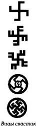 Пожалуй, основополагающий знак солярной символики. Впервые этот символ, наряду с некоторыми другими символами германского язычества, присвоил для своей фашистской державы Адольф Гитлер. С тех пор и повелось, если свастика — значит, речь идет о фашизме. На самом же деле, свастика не имеет никакого отношения к безобразию, называемому фашизмом. Знак этот есть изображение солнца, обращение к светлым богам; он приносит благо и справедливость в мир Яви, несет в себе огромный заряд светлой магической энергии. Классическое санскритское название этого символа происходит от индоевропейского корня «su/swa», что означает «связанный с благом». Вспомним птицу Матерь Сва (покровительницу Руси), бога Сварога, Сваргу — место обитания светлых богов славянских мифов. К этому же корню относится слово «свет». У славян свастику называли коловрат или солнцеворот. Однако коловрат все же начинается с шести лучей. Так как коло — это круг, кольцо, колесо, колодец, колобок. Коловрат во все века и у всех народов был символом солнца, есть основания даже полагать, что солнце в древности называлось именно «коло». Также некоторые авторы связывают его с единством статики и динамики. Причем динамический смысл имеет только вращающаяся свастика. Если она вращается по часовой стрелке (вправо), то символизирует стремление ко всему связанному с жизнью, с положительными качествами и активным мужским началом; вращение же против часовой стрелки, напротив, указывает на умирание, на отрицание всего положительного и пассивность поведения. Абсолютно наоборот трактуют направление вращения своей свастики греки (называвшие этот знак «тетракселе» — «четвероногий», «четырехконечный»), так как узнали о свастике они от недружественных им славянских народов и решили, что то, что славянам — Правь, им — Аид. Отсюда много путаницы с направлением вращения и направлением лучей у свастик. Свастика — это не только четырехлучевой знак. Бывают также и свастики с 2, 3, 5, 6, 7, 8 и более лучами. Каждый вид свастики имеет свое специфическое магическое значение. Разберем некоторые виды свастик. Шестиконечный крест, заключенный в круг, — громовой знак Перуна. Распространен этот знак был очень широко, его знали и скандинавы, и кельты, и славяне. Громовой знак мы можем увидеть в орнаменте русских прялок и на избах вплоть до нашего времени. Вырезали его на них не просто так. На избах его вырезали на кокошнике (доска, свисающая с торца конька) в качестве магического громоотвода.