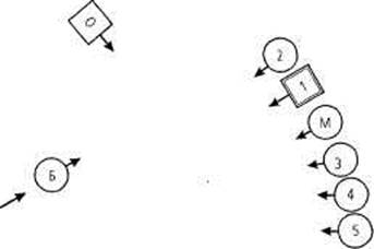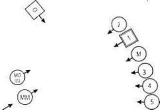 Рис. 17.1: О - отец; М - мать; 1 — первый ребенок (Томас); 2 — второй ребенок, дочь; 3 — третий ребенок, дочь; 4 — четвертый ребенок, дочь; 5 — пятый ребенок, дочь. Б.Х. (участникам, исполняющим роли членов семьи Томаса): На кого вы все злитесь? Второй ребенок: На отца? Б.Х.: Нет. (Томасу): На Бога. Спрашивается только, является ли это божество мужчиной или женщиной. Томас: Я не знаю. Это трудно определить. Б.Х: Когда в ходе расстановки словно ощущается присутствие божества, это означает, что один из членов семьи отождествляется с ним. Томас: Тогда это мужчина. Б.Х.: Я в этом не уверен. Как чувствует себя отец? Отец: Очень плохо. Я смотрю в пустоту и не имею ничего общего с остальными. Б.Х.: Да, действительно, посланная тебе милость не помогла. (Участнице, исполняющей роль матери): Как чувствует себя мать? Мать: Просто ужасно. Б.Х. (исполняющему роль Томаса): Как чувствует себя сын? Первый ребенок: Плохо. Мне хочется отсюда уйти. Второй ребенок: Я чувствую большую нагрузку. Словно я мать-одиночка.