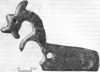 лежности рассматриваемых кладов и случайных находок славянам-антам (Спицын А. А., 1928, с. 492 — 495). Серьезная аргументация этого предположения приведена Б. А. Рыбаковым (Рыбаков Б. А., 1948, с. 57-71; 1953а, с. 23-104). Позднее И. Вернер еще раз убедительно показал, что одиночные пальчатые фибулы были частью славянской женской одежды, и составил карту распространения этих украшений (Werner /., 1950, S. 150-170; 1960, S. 114-120). В последние годы пальчатые фибулы были найдены на достоверно славянских памятниках, в том числе в жилищах и захоронениях, что не оставляет никаких сомнений в этнической атрибуции этих украшений. Их картография (карта 5) свидетельствует, что пальчатые фибулы были характерны не для всех славян, а в основном для их племенной группировки, которой принадлежат памятники пражско-пеньковского типа. На поселениях пеньковского типа встречены и другие предметы, сопоставимые с находками в кладах. Так, на селище Скибинцы (Остров Мытковский) в Винницком Побужье найдена литая фигурка льва (рис. 6; табл. IV, 7). На поселении Требужены в Молдавии обнаружена подвеска в виде фигуры человека с согнутыми ногами и упирающимися в бедра руками (Рафалович И. А., 1972, рис. 4). Стилистически она близка накладкам из Мартыновского клада. Интересна бронзовая фигурка лошади, найденная па поселении Самчинцы (рис. 7; табл. IV, 9). Из поселения Семейки происходят серьги пастырского типа и фигурка медного конька с причудливо узорчатой головой. В одной из полуземлянок селища Селиште найден фрагмент двупластинчатой фибулы. Наконец, выявлена непосредственная связь поселения пражско-пеньковского типа у с. Вильховчик с кладом мартыновского типа. Бляшки от поясного набора мартыновского облика встречены здесь в округлобоком глиняном сосуде пражско-пеньковских традиций (Приходнюк О. М., 1979а, с. 90, 91). Впрочем, нельзя, конечно, утверждать, что все кла Некоторые венгерские исследователи связывают Очевидно, к культовым предметам принадлежат небольшие фигурки животных из обожженной глины. Все они вылеплены из одного комка глины, изображение схематичное и стилизованное. Намечен лишь общий контур животного, поэтому определить вид его не представляется возможным. Лишь одна фигурка с поселения Ханска II выполнена в реалистической манере и не оставляет сомнений в том, что изображен конь. На поселении VI—VII вв. в Старых Малаештах найдена глиняная фигурка человека с широко раздвинутыми ногами и поднятыми до уровня плеч руками. Изображение стилизовано и несколько условно. Погребальными памятниками славян, оставивших пражско-пеньковскую керамику, были бескурганные могильники с захоронениям по обряду трупосожже-ния. Обнаружены и исследованы они пока в очень немногих пунктах. Остатки трех таких могильников были раскопаны в районе с. Великая Андрусовка в бассейне Тясмина (Верезовецъ Д. Т., 1969, с. 58—70). Два из них сохранились частично, - третий — относительно хорошо. Площадь последнего около 1,5 га. Раскопками охвачено 1000 кв.м и выявлено 29 захоронений. Во всех случаях остатки кремации, совершенной на стороне, были помещены в очень небольшие неглубокие ямки. Погребения — урновые и без-урновые, все безынвентарные. Единичные погребения того же типа известны в Прутско-Днестровском междуречье. По металлическим находкам памятники типа Пень-ковки в целом датируются VI—VII вв. Однако имеются некоторые основания п