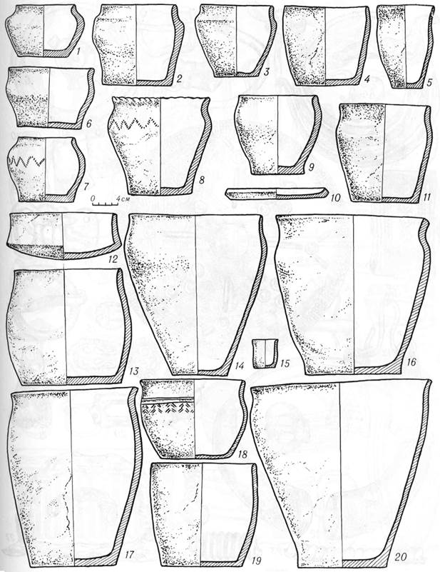 Таблица XIII. Керамика и вещи из поселений и могильников мощинской культуры 1, 2-Неквасино; 3-7, 9, 12, 14, 17-20 - Мощины; 8, 10, 11, 16 — Шаньково, курган 2; 13 — Почепок, курган 1; 15 — Почепок, курган 2 1—3, 5—7 — железо; 4, 8—20 — глина