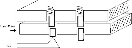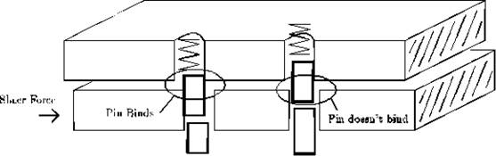 Горизонтальная модель иллюстрирует основной дефект вскрываемых замков. Этот дефект позволяет открыть замок, поднимая по одному штифту за раз, и поэтому Вам не нужен ключ, чтобы поднять все штифты одновременно. Рис. 4.1-4.3 показывает, как можно проталкивать штифты замка по одному за раз. Первый шаг процедуры – подвергнуть нижнюю пластину действию механической силы, направленной вдоль нее. Благодаря этому один штифт или более оказываются подогнанными вплотную к стенкам отверстий верхней и нижней пластины. Самый распространенный дефект замка заключается в том, что только один штифт прилегает впритык к стенке отверстия. На рис. 4.1 вплотную к стенке отверстия прилагает левый штифт. Его можно протолкнуть вверх отмычкой, см. рис. 4.2. Когда верхушка ключевого штифта достигает линии вращения, нижняя пластина слегка смещается. После прекращения воздействия на ключевой штифт отмычкой направляющий штифт будет удерживаться вверху нижней пластиной, а ключевой штифт возвратится в первоначальную позицию, см. рис. 4.3. В результате небольшого смещения нижней пластины новый штифт оказывается прилегающим вплотную к стенке отверстия. Для проталкивания этого нового штифта используется та же процедура. Таким образом, метод вскрытия замка по принципу один штифт за раз заключается в том, чтобы воздейтсвовать на нижнюю пластину механической силой, направленной вдоль нее, найти штифт, который плотнее всех остальных прилегает к стенке отверстия, и протолкнуть его вверх. Когда верхушка ключевого штифта достигает линии вращения, подвижная часть замка слегка сдвигается, и направляющий штифт оказывается удержанным над линией вращения. Эта процедура называется проталкиванием штифта. В гл. 9 рассматриваются различные дефекты, из-за которых только один штифт прилегает впритык к стенке к отверстия. • 1. Примените механическое воздействие. • 2. Найдите штифт, более всех остальных прилегающий к стенке отверстия. • 3. Протолкните этот штифт вверх, пока он не установится над линией вращения. • 4. См. пункт 2.