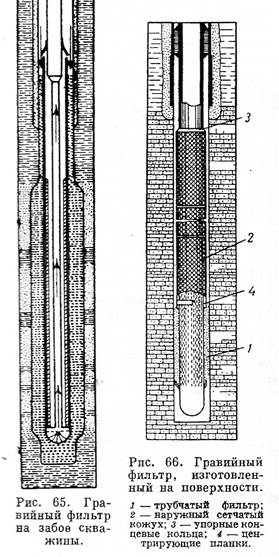 Щелевидные фильтры дороги в изготовлении и не всегда надежно предотвращают поступление песка в скважину или часто засоряются. Поэтому применяют также и другие способы оборудования забоя для предотвращения поступления песка в скважину. Например, забой скважины оборудуют иногда металло-керамическими, песчано-пластмассовыми или гравийными фильтрами (рис. 65), которые образуются при заполнении гравием кольцевого пространства между трубным фильтром и стенками скважины. Для увеличения толщины слоя гравийного фильтра скважину по всей мощности пласта предварительно обрабатывают гидравлическим расширителем. Гравий в кольцевое пространство закачивают вместе с промывочной жидкостью с поверхности. Полное заполнение расширенного места гравием фиксируется обычно повышением давления на насосе. Устройство гравийных фильтров таким способом — весьма сложный процесс. Поэтому предпочтение отдают предварительно уплотненным гравийным фильтрам (рис. 66), которые изготовляют на поверхности секциями. Каждая секция состоит из фильтровой трубы, наружной сетки и гравия, уплотненного между соткой и фильтровой трубой. Считается, что для образования надежного песчаного «моста» достаточна толщина слоя гравия, равная 5—6 диаметрам его зерен. Размер зерен гравия также определяют по диаметру зерен 10%-ной фракции кривой механического состава пластового песка d10%. По опытным данным, наилучшее соотношение между диаметром гравия drp и песка 10%-ной фракции должно быть dгр/ d10% < 12; для создания некоторого запаса принимают dгр/ d10% =6¸8.