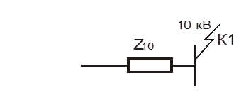 Рис 5.3 -. Схема замещения для расчета КЗ в т.К1 Определяем полное сопротивление до точки К1 Z1=Z10 Z1=1,57 Ом Ток трёхфазного к.з. в т. К1., равен: