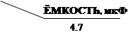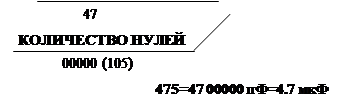 В. Код содержит четыре знака (буквы и цифры), обозначающие номинальную емкость и рабочее напряжение. Буква, стоящая вначале, обозначает рабочее напряжение, последующие знаки – емкость в пикофарадах (пФ), а последняя цифра – количество нулей. Возможны 2 варианта кодировки емкости: а) первые две цифры указывают номинал в пФ, третья – количество нулей; б) емкость указывают в микрофарадах, знак μ выполняет функцию десятичной запятой. Ниже приведены примеры маркировки конденсаторов емкостью 4,7мкФ и рабочим напряжением 10В.
