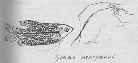— Давно рыбок разводишь? — негромко спросил Сергей Ермолаевич. Юрка не расслышал вопроса. Он комкал в потной ладони свой единственный рубль и мучительно думал, что делать, попытаться выпросить у Василя Федоровича за этот рубль какую-нибудь гурами поменьше или купить дафнии? Но рыбки дома не кормлены уже три дня, если не принести дафнии, подохнут с голода, а их ведь тоже жалко, хоть они и не такие красивые, как жемчужные гурами! Да и мальки пропадут... Нет, это не годится! Кожар догадывался, что происходит в душе у мальчика. Он положил руку Юрке на плечо и повторил: — Давно разводишь рыбок, сынок? Юрка вздрогнул, оторвал глаза от банки с жемчужкам и растерянно посмотрел на Сергея Ермолаевича. — Я не развожу,— смущенно пробормотал он.— Я приехал за кормом. Мне дядя подарил маленький аквариум и несколько рыбок, а корм кончился. — Дафнию продают дальше, вон там, в углу,— сказал Кожар.— Тебя как зовут? Юра? А меня — Сергей Ермолаевич. Идем вместе, мне тоже нужно корм посмотреть. Ты, поди, даже не знаешь еще, как большинство рыбок называются, правда? Юрка благодарно улыбнулся. — Понятия не имею. Рыбок столько — прямо глаза разбегаются. Вот уж не думал, что их так много. — Э-э, здесь еще не так-то и много,— протянул Серп Ермолаевич.— Ты бы походил по зоомагазинам в Одессе или в Москве! Вот там рыбок так рыбок! Ну да ничего, для первого знакомства с тебя и этих хватит... Кстати, Василь Федорович, почему Сашки нет? — Придет еще,— равнодушно ответил дядя Вася.— С неонами что-то мудрит. Кожар и Юрка нырнули в толпу, а дядя Вася поднял банку со сверкающим жемчугом и хрипло закричал на весь рынок: — Жемчужные гурами! Жемчужные гурами! Совсем бесплатно — три рубля парочка. Подходи, народ честной, забирай к себе домой! Рыбки дома поживут и малечков принесут! — Интересные рыбки — гурами,— негромко говорил Сергей Ермолаевич Юрке, пока они пробивались сквозь толпу. Родом они с Малакского полуострова, в Индии водятся, в Индонезии. В Европу их еще в прошлом веке привезли. И такая с ними приключилась удивительная история. Наловят рыбок, посадят в бочки с водой, плотно запечатают и — на корабль. Привезут — часть рыбок уже мертвая, часть за какую неделю погибнет. Ломали аквариумисты головы, отчего да почему,— ничего не могли понять. Ну, начали наблюдать за ними. Смотрят: рыбки поплавают, поплавают, потом — раз на поверхность. Вроде как воздуха вдохнут. Оказалось, они и вправду воздухом дышат. Конечно, в первую очередь кислородом, который в воде растворен, но и обычным воздухом тоже. У них для этого такой специальный орган есть — лабиринт. Из-за того-то они, оказывается, и гибли, что их воздуха лишали. Нальют бочку водой доверху, запечатают — откуда там воздуху взяться... Совсем недавно вычитал все это Сергей Ермолаевич сам, и одно удовольствие было ему наблюдать, с каким восторгом слушает его Юрка. — А что, одни гурами такие... с лабиринтом? — запинаясь, произнес Юрка и крепче сжал свою баночку для дафний в потной ладони. — Что ты,— засмеялся Кожар.— Их, этих лабиринтовых, больше дюжины. Одних только гурами вон сколько! — Не обращая внимания на толчею, он остановился и принялся загибать пальцы: — Жемчужные — раз, пятнистые — два, голубые, мраморные, карликовые — вот тебе уже пять. А еще рыба-ползун есть, петушки, лябиозы, лялиусы, макроподы, купанусы... Их пропасть, этих лабиринтов