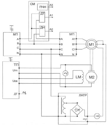1.1 Исследование рабочих свойств синхронного двигателя 2.1 Изучить схемы для исследования асинхронного электродвигателя с короткозамкнутым ротором (в дальнейшем изложении АД) 2.2 Снять механическую и электромеханическую характеристики двигателя 2.3 Построить зависимость η, cosφ = f(M) 2.4 Построить энергетические диаграммы двигателя для нескольких режимов работы 2.5 Провести обработку экспериментальных данных, составить отчет и сделать заключение по работы В лабораторной работе используются следующие модули: - модуль питания стенда (МПС); - модуль питания (МП); - силовой модуль (СМ); - модуль тиристорного преобразователя (ТП); - модуль автотрансформатора (ЛАТР); - модуль измерителя мощности (МИМ); - модуль ввода/вывода (МВВ); - модуль измерительный (МИ). 4.1 Перед проведением лабораторной работы необходимо привести модули в исходное состояние: - переключатель «Сеть» тиристорного преобразователя перевести в нижнее положение, переключатель SA3 – в положение «Руч», SA4 – в положение «НМ», SA6 «Разрешение» – в нижнее положение; - переключатель SA1 модуля ЛАТР перевести в нижнее положение, рукоятку автотрансформатора вывести в крайнее положение против часовой стрелки. 4.2 Исследуемый асинхронный двигатель входит в состав электромашинного агрегата, включающего в себя собственно исследуемый двигатель М1, нагрузочный генератор – машину постоянного тока – М2, импульсный датчик частоты вращения – М3. Для проведения работы на персональном компьютере должно быть загружено ПО Labdrive и выбрана соответствующая работа. Описание программного обеспечения Labdrive и LabShow приведено в приложениях Д, Е. Схема для исследования синхронного электродвигателя представлена на Статорная цепь синхронного двигателя, исследуемого в данной работе, подключается к выходам 3х380В модуля питания через измеритель мощности и датчики тока и напряжения. В роторную цепь подается постоянное напряжение с выхода = U модуля автотрансформатора. Для этого две фазы обмотки ротора включаются параллельно.