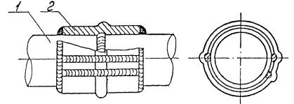 Трубопровод; 2 - муфта Скобы; 2 - планки; 3 - гайка; 4 - маховичок; 5 - червяк; 6 - пята; 7 - планки; 8 - прокладки (бензостойкая резина или свинец); 9 - шарнирное соединение; 10 - трубопровод; 11 - сварной шов.
