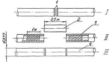 Рис. 4. Ликвидация разрыва (трещины) трубопровода вставкой катушки (пример): I - разорвавшаяся по сварному стыку труба; II - вырезка аварийного стыка и введение глиняных пробок; III - пригонка нового патрубка (катушки) и вварка его в трубопровод; 1 - разорвавшийся стык; 2 - патрубок (катушка); 3 - глиняные тампоны; 4 - трубопровод после ликвидации аварии Газопроводы: Свищи, образовавшиеся в газопроводе, ликвидируют путем заварки, для чего края свища тщательно подготавливают под сварку. Если на газопроводе появились трещины в сварных стыках или по целому металлу, то дефектные участки удаляют, а на их место вваривают патрубки. Аварии, происшедшие в результате заклинивания пропускаемых внутри трубопровода устройств, ликвидируются после определения места нахождения этих устройств и пробок путем замены участка трубопровода. Аварии на линейной арматуре ликвидируются: в сальниковых устройствах (донабивкой сальниковых камер) без остановки перекачки с помощью специальных приспособлений; во фланцевых соединениях (между крышкой и корпусом, на байпасах) - с остановкой перекачки, заменой прокладок; при разгерметизации корпуса задвижки либо потере работоспособности запорного устройства - путем вырезки целиком задвижки и замены ее на новую. При авариях на соединительных элементах трубопровода (тройники, переходники, отводы) восстановление должно проводиться путем замены дефектной детали соответствующей по параметрам новой. Аварийно-восстановительные работы необходимо обеспечить выполнением подготовительных мероприятий: уточнение места аварии и задержание продукта; доставка ремонтных средств и персонала к месту аварии; подготовка ремонтной площадки; организация водоотлива и водоотвода; обеспечение безопасности соседних коммуникаций и объектов народного хозяйства.