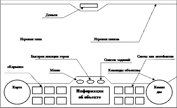 Интерфейс состоит из: - игровой радар - показывает расположение героев, юнитов и зданий на карте - "карман" - набор слотов(6 шт.), в которые вставляются купленные заклинания - Информация об объекте - параметры персонажа, окно анимированного персонажа - панель управления - на ней располагаются кнопки управления - "стоп-отмена", "защита", "атака", "следовать+атака", "патруль" - инвентарь - набор слотов для артефактов (6 шт.)