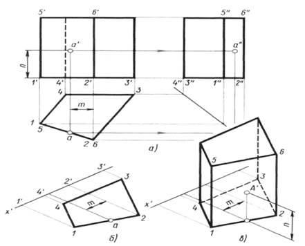 Рис. 8 – Проекция точки на призме По имеющемуся комплексному чертежу призмы можно выполнить ее аксонометрическую проекцию по координатам вершин. Для этого вначале строят нижнее основание призмы (рис.8,б), а затем — вертикальные ребра и верхнее основание (рис.8, в). По координатам тип точки А, взятым с комплексного чертежа, можно построить аксонометрическую проекцию этой точки.