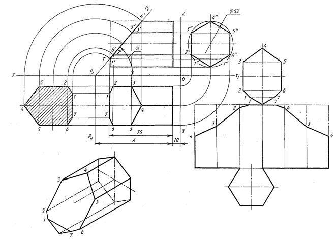 Построение плоского сечения прямого кругового цилиндра аналогично построению плоского сечения призмы, так как прямой круговой цилиндр можно рассматривать как прямую призму с бесчисленным количеством ребер–образующих цилиндра. На рис. 16, а даны три проекции прямого кругового цилиндра, пересеченного фронтально-проецирующей плоскостью Р. Из комплексного чертежа видно, что плоскость Р пересекает не только боковую поверхность, но и верхнее основание цилиндра. Как известно, плоскость, расположенная под углом к оси цилиндра, пересекает его по эллипсу. Следовательно, фигура сечения в данном случае представляет собой часть эллипса. Фронтальная проекция фигуры сечения совпадает с фронтальным следом P vплоскости Р. Горизонтальная проекция этой фигуры совпадает с горизонтальной проекцией основания цилиндра. Профильная проекция фигуры сечения представляет собой часть эллипса. Любая кривая линия может быть построена по нескольким точкам. Например, чтобы построить профильную проекцию какой-либо точки, принадлежащей фигуре сечения (например, точки 6), намечают фронтальную проекцию этой точки 6'(на следе плоскости Р v ) и, проведя через нее линию связи до пересечения с горизонтальной проекцией окружности основания, находят искомую точку 6.Применяя линии связи, по двум имеющимся проекциям 6' и 6 находят профильную проекцию 6".Полученные таким образом профильные проекции точек фигуры сечения соединяют кривой по лекалу. Действительный вид фигуры сечения получен на рис. 16,а способом перемены плоскостей проекций. Горизонтальная плоскость проекций заменена новой. Новая ось проекций хi может быть проведена параллельно следу Pv на произвольном расстоянии, но для упрощения построений - выполнена совпадающей с Р у (аналогично рис. 15). От оси x1 откладывают отрезки 5'50 = 55х, 4'40 = 44х, т.е. отрезки т, п и т.д., так как расстояние от новой проекции этой точки до новой оси проекций равно расстоянию от прежней проекции этой точки до прежней оси проекций.