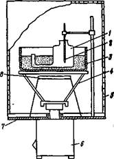 Рис. 2.22. Установка для определения скорости выгорания жидкостей: / — прибор СВ; 2 — термометр; 3 — металлический противень; 4 — кронштейн; 5 — сетка; 6 — электрические весы; 7 — металлический поддон; 8 — нагревательный элемент Кронштейн позволяет устанавливать противень с песком и прибором СВ на чашу весов. Нагревательный элемент имеет спираль сопротивлением 0,9±0,1 Ом; подаваемое на спираль напряжение 12 ±2 В, сила тока 11 ± 1 А. Лабораторный термометр может быть любого типа с пределом измерения от 0 до 200 °С и ценой деления 0,5 °С. Стеклянная пластинка служит для гашения пламени горелки после испытания. В резервуар прибора СВ заливают исследуемую жидкость (60 ± 10см3) с таким расчетом, чтобы уровень жидкости в горелке был на 2,5 ±0,5 мм ниже верхнего края горелки. Уровень контролируется шаблоном. На чашу весов, используя кронштейн, устанавливают противень с песком и прибором СВ. Между горелкой и резервуаром с исследуемой жидкостью ставят алюминиевый экран. В резервуар опускают термометр, закрепленный в штативе. Нагревают жидкость до температуры воспламенения и зажигают ее в грелке прибора СВ. Скорость выгорания, кг/(м²·мин)