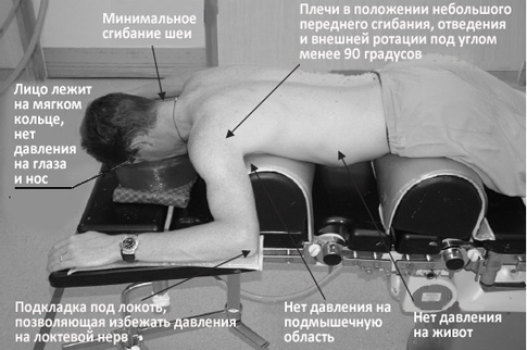 Многие физиологические изменения, которые происходят в этом положении, могут быть минимизированы внимательным подходом к процедуре укладывания пациента. Следующая иллюстрация – пример правильного размещения пациента в положении лицом вниз: