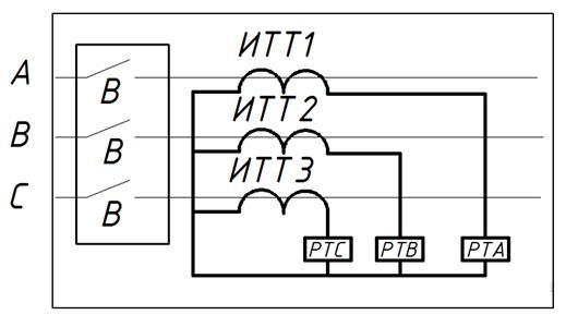 Рисунок 21. Схема включения ИТТ и реле На данной схеме используются следующие обозначения: В – выключатель; А.В,С – фазы; РТА, РТВ,РТС – реле тока соответствующей фазы.