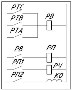 Рисунок 23.Логическая схема действия защиты МТЗ-3 Принцип действия на примере МТЗ-1 Если произошло короткое замыкание на фазе А, то срабатывает реле тока РТА, тем самым давая путь току к реле времени РВ, которое срабатывает через время равное времени уставки tуст=0,75 с. После срабатывания реле времени ток проходит через промежуточное реле РП, в котором сигнал делится на два, один из которых идет на указательное реле РУ, второй же на катушку отключения КО. При срабатывании РУ выпадает блинкер или загорается лампочка. КО находится внутри выключателя В (рис.21). Список литературы 2. http://forca.ru/