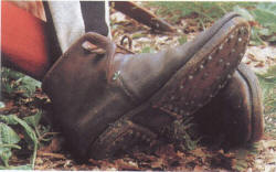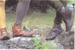 Крепкая обувь важна для солдата. В средние века наиболее распространены были похожие на мокасины башмаки с мягкой подошвой. Подошва подшивалась к верхней части башмака, после чего башмак выворачивался так. чтобы все швы оказались внутри. Затем снаружи подшивалась толстая подметка. Среди крестьян м путешественников были популярны высокие ботинки, завязывающиеся на шнурки, застегивающиеся на пряжку или закрывающиеся с помощью ремня, свидетельства о толстых подошвах, каблуках и подбитых гвоздями подметках встречаются редко. Уильям Ленгленд (1360-1399) описывает подбитые гвоздями башмаки в The Vision Concerning Piers Plowman. Многие солдаты старались обзавестись износостойкой обувью, не стесняясь снимать подходящие башмаки даже с трупов.